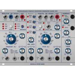 The 259t is the largest and most complex analogue oscillator from Don Buchla's legendary 200 modular synthesizer. The 259 originated the concept of the "Complex Oscillator" in the 1970s and has been reissued by Buchla & Tiptop Audio in Eurorack format. The module consists of two oscillators, called the Modulator and Principal, with a middle section that provides voltage control over the internal modulation paths between the two oscillators, resulting in highly complex timbres. Additionally, the principal oscillator passes through multiple unique voltage-controlled waveshapers and crossfaders for further signal processing. The module's pitch can be controlled with 1V / OCT or via its internal auto-tuner and ART control to create precisely pitched notes.
